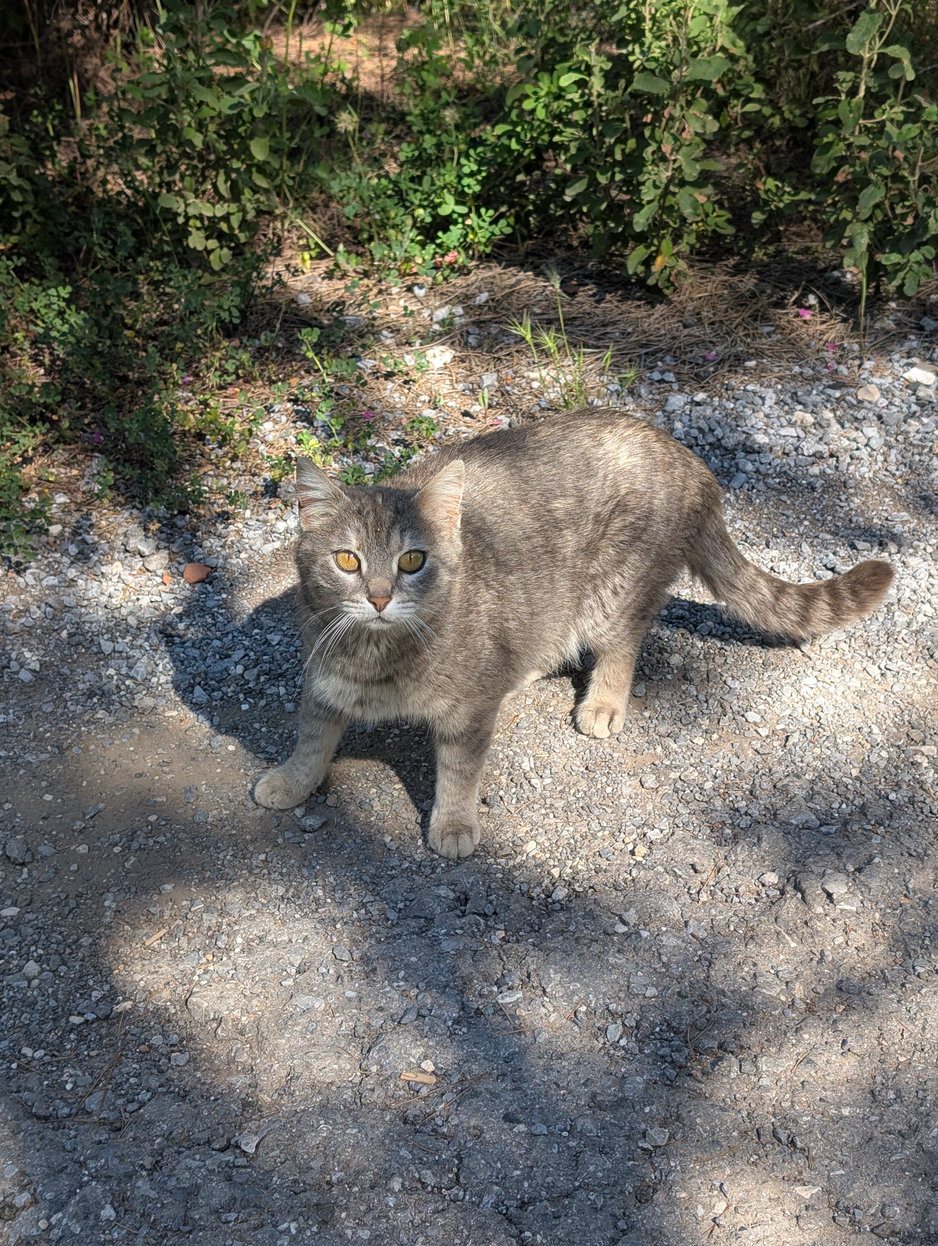A grey tabby stray cat stands on a gravel path, looking up at the camera with striking amber eyes. Dense green shrubs and wild plants fill the background. ALT